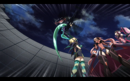 This is followed by kick-ass shots of the good guy Symphogears transforming, with mythological backdrops that suit their individual Relics.